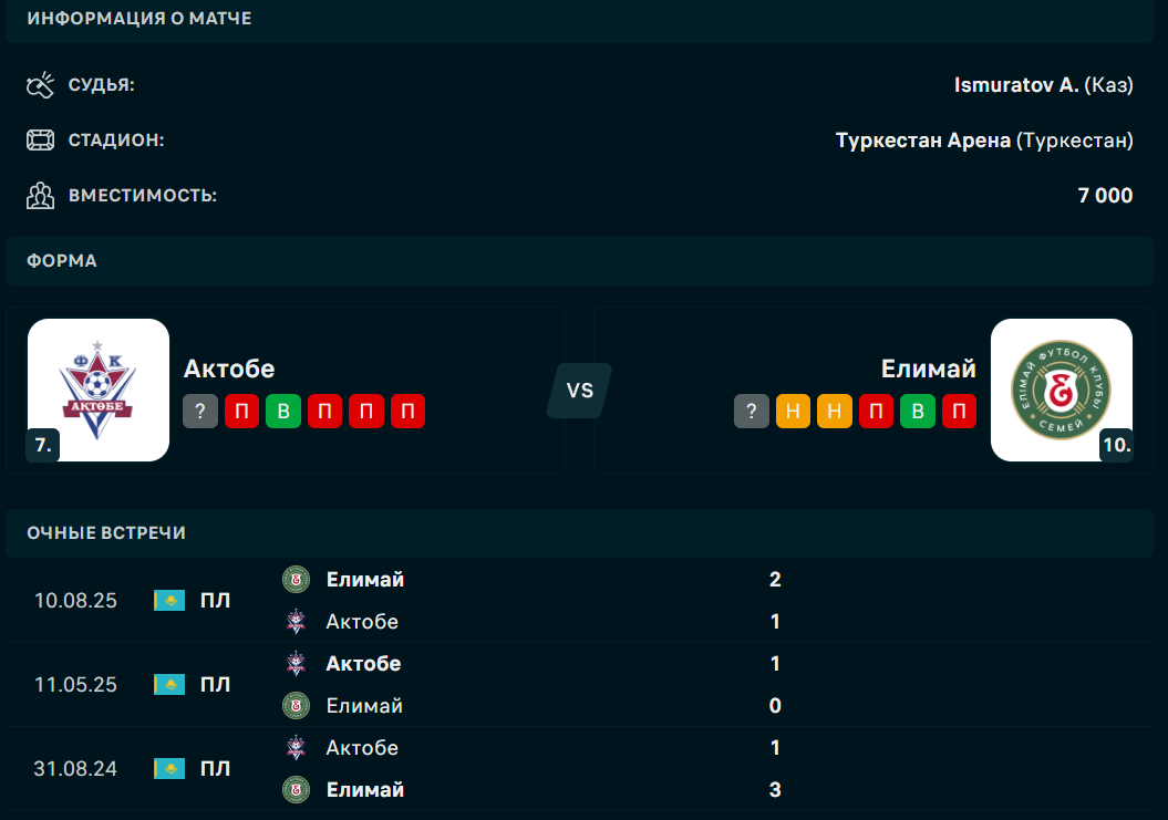 Матч состоится на стадионе "Туркестан арена" в Туркестане. Стартует противостояние в 17:00 по местному времени. "Актобе" к этой встрече подходит с тремя набранными очками и седьмой позицией в таблице. "Елимай" же, 10-ый с двумя заработанными баллами. В последних трех матчах "Елимай" дважды обыграл "Актобе", проиграв лишь раз.