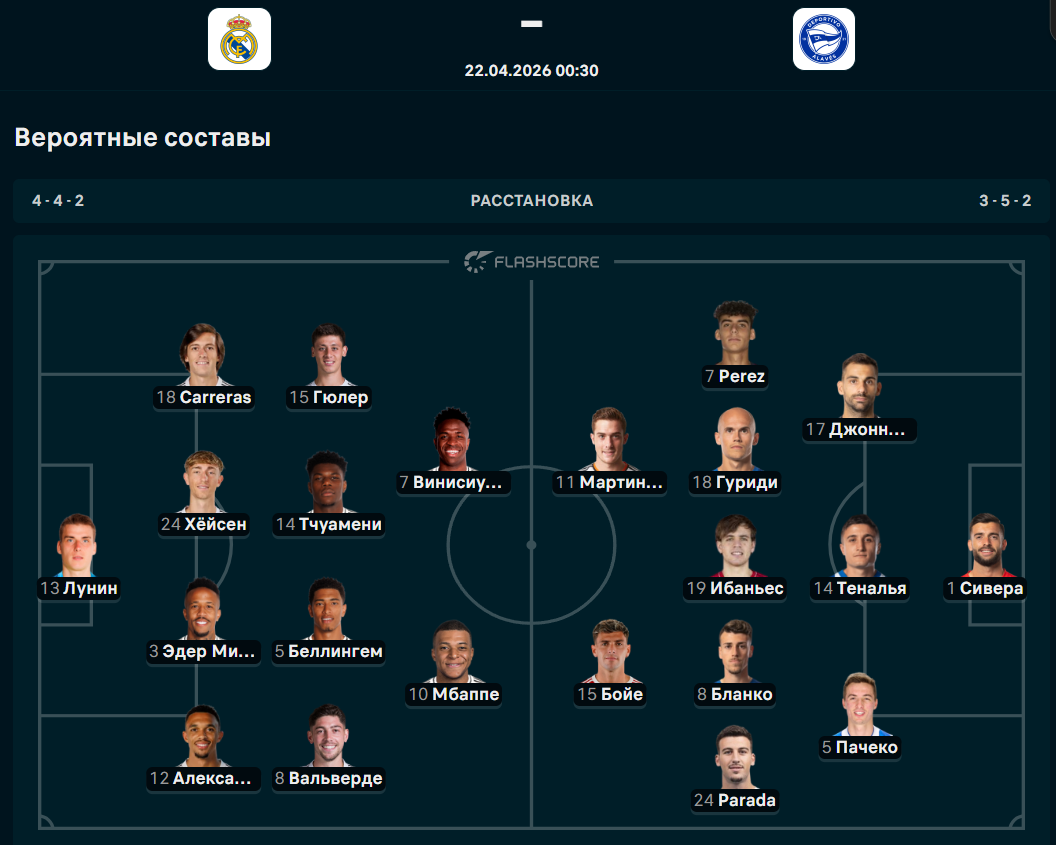 У "Реала" точно не сыграют Куртуа, Ассенсио и Родриго. В составе "Алавеса" на поле не смогут выйти Гарсес, Протессони и Рыбах. Ниже доступны вероятные составы команд.