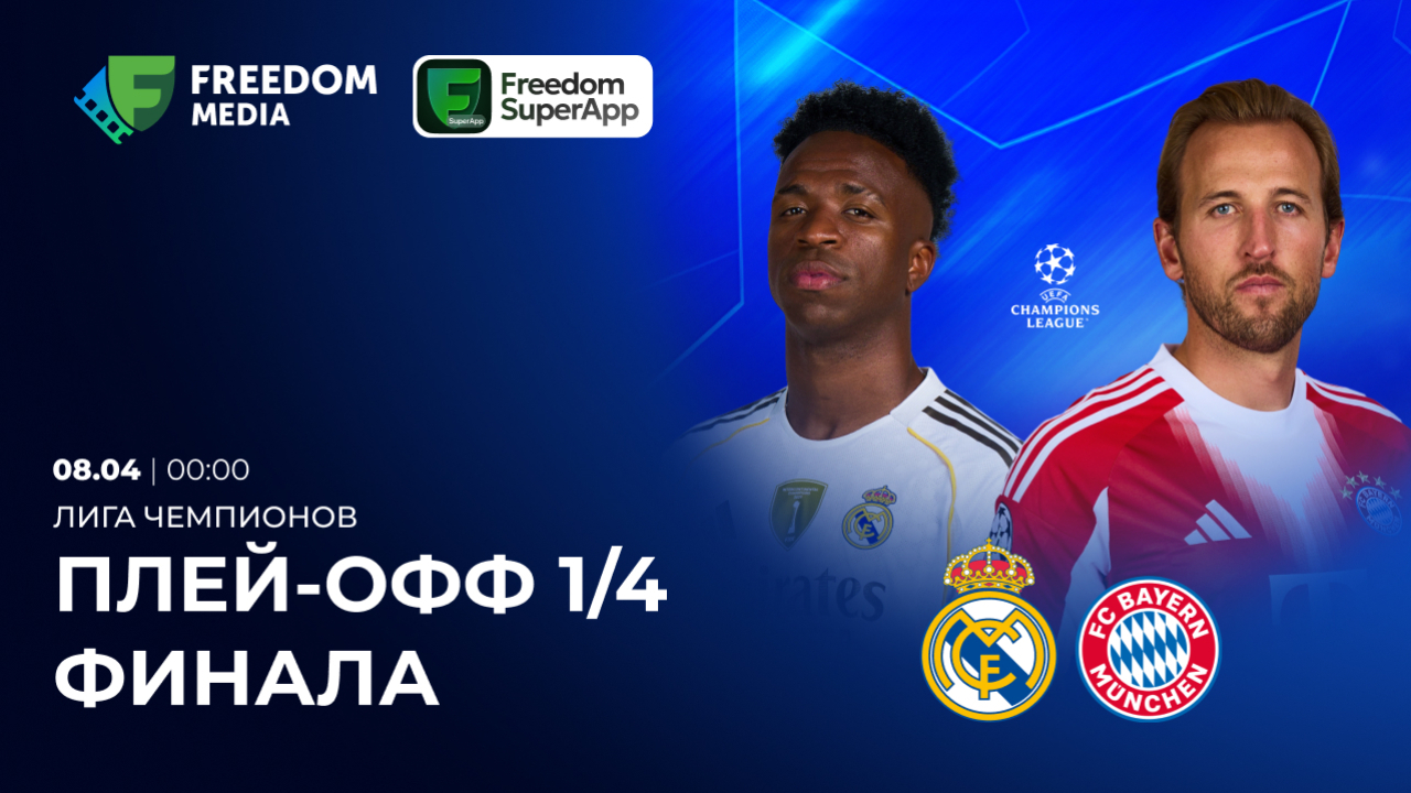 В ночь на 8 апреля стартует 1/4 финала Лиги чемпионов. Эту стадию откроют матчи "Реал" -"Бавария" и "Спортинг" - "Арсенал". Казахстанцы могут посмотреть эти матчи на Freedom Media всего за 5 тенге с подпиской на 30 дней.