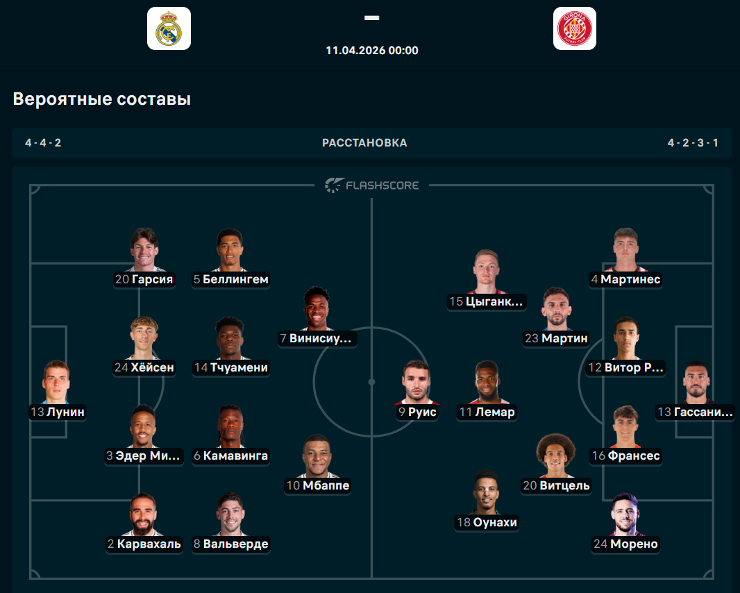 У "Реала" точно не сыграют Куртуа, Мастонтуно и Родриго. В составе "Жироны" на поле не смогут выйти Артуро, Хуан Карлос, Порту, Тер Штеген, Ван ден бек и Ванат. Ниже доступны вероятные составы команд.