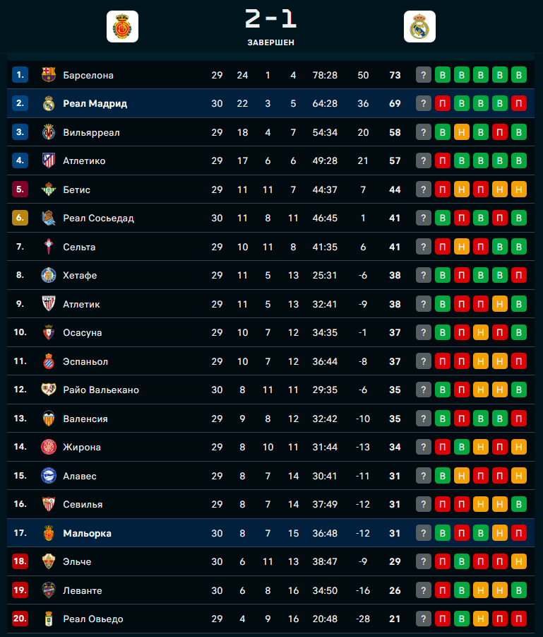 Мадридский клуб отстает на четыре пункта от "Барселоны" в таблице чемпионата Испании, имея на матч больше. До конца сезона остается сыграть 8 туров. "Мальорка" благодаря победе над "Реалом" выбралась из зоны вылета и идет на 17-й позиции в таблице.