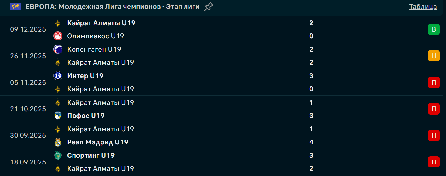 - "Кайрат" провел всего шесть матчей, из которых проиграл четыре: "Спортингу" (2:3), "Пафосу" (1:3), "Интеру" (0:3), один раз сыграл вничью с "Копенгагеном" (2:2), а также обыграл "Олимпиакос" (2:0).