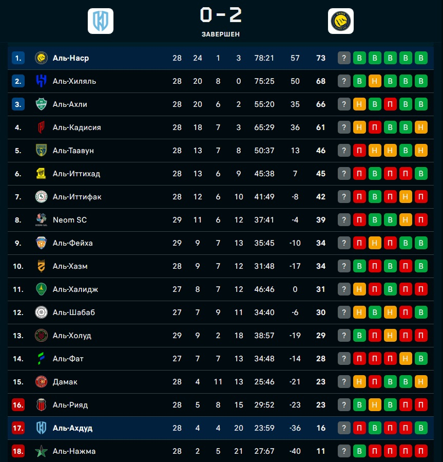 За 6 туров до финиша сезона "Аль-Наср" лидирует в таблице, опережая идущий следом "Аль-Хилал" на пять очков.