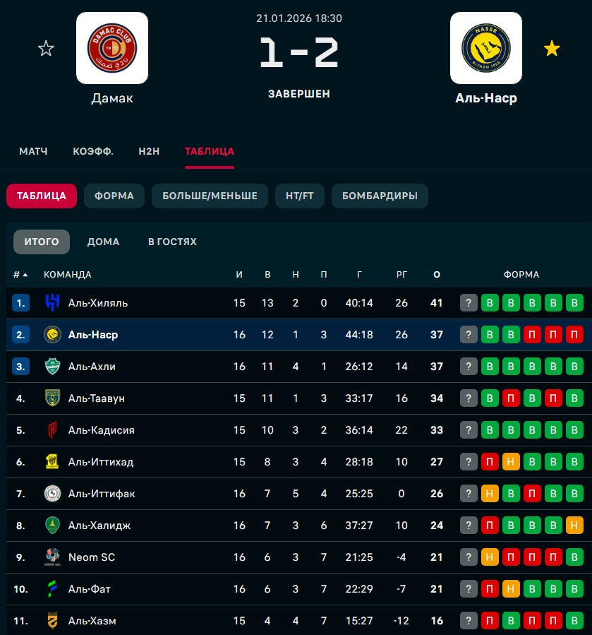 Роналду лидирует в списке бомбардиров - 16 голов в 16 турах. Его команда занимает второе место в таблице, уступая "Аль-Хилалу" четыр очка и имея на матч больше.