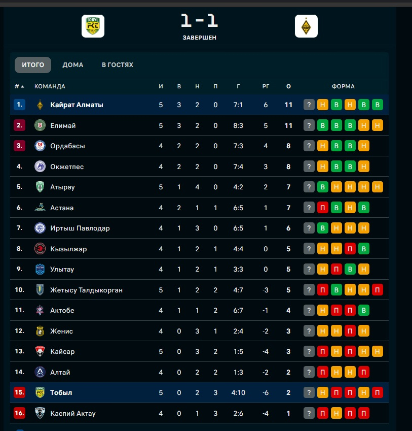 В таблице КПЛ "Кайрат" набрал 11 очков и идет на первой позиции.