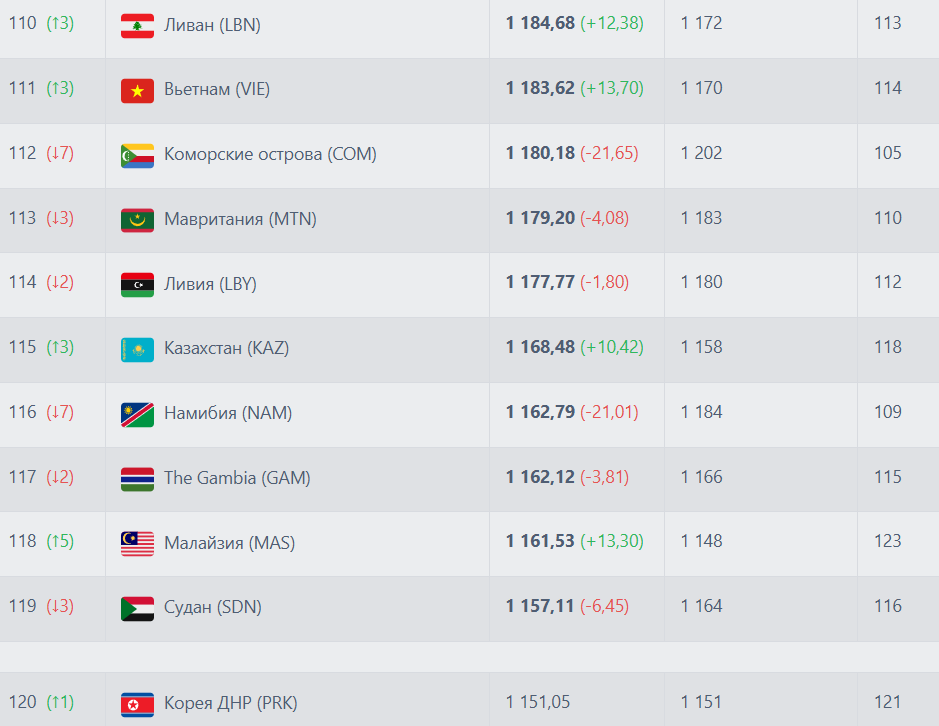 По данным сайта Football-ranking.com, Казахстан поднялся на три строчки, расположившись между Ливией и Намибией.