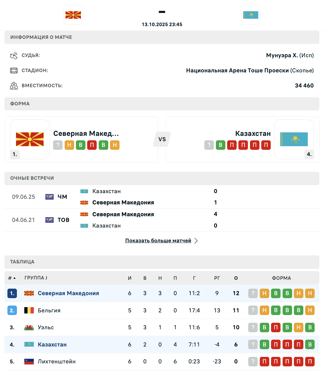 Встреча состоится сегодня, 13 октября, в Скопье (Северная Македония). Противостояние стартует в 23:45 по времени Астаны. Сейчас у Казахстана, идущего четвертым, в активе шесть очков. Македонцы лидируют в группе с 12 баллами. Первая встреча соперников в Астане завершилась минимальной победой гостей со счетом 1:0.