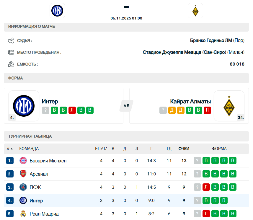 Сейчас "Интер" с 9 баллами входит в группу лидеров общей таблицы, а "Кайрат" с одним очком находится на 34-ой строчке. Ранее алматинский клуб проиграл лиссабонскому "Спортингу" (1:4), мадридскому "Реалу" (0:5) и сыграл вничью с кипрским "Пафосом" (0:0).