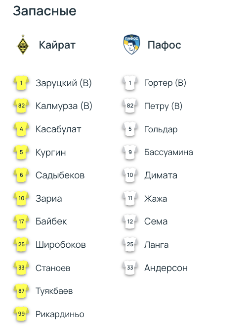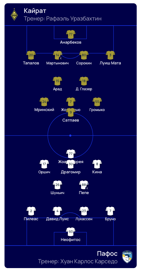 Составы на матч "Кайрат" - "Пафос" в Лиге чемпионов