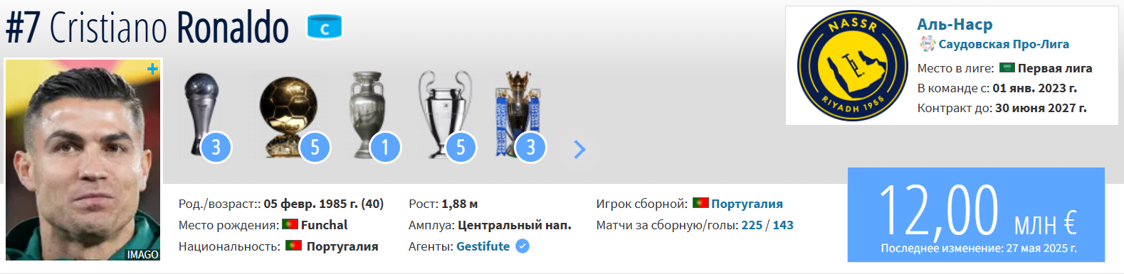 Напомним, что Криштиану выступает за саудовский "Аль-Наср" с января 2023 года. Срок действующего трудового соглашения между нападающим и клубом истекает в конце июня 2027-го.