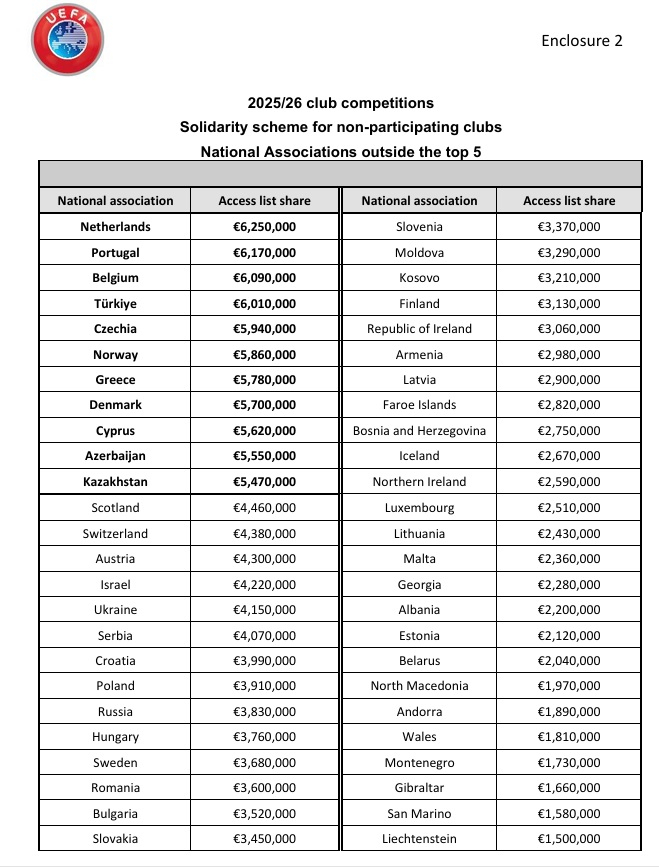 Согласно документа, опубликованного на сайте УЕФА, Казахстанская федерация получит 5 миллионов 470 тысяч евро. Это 11-й результат без учета топ-5 лиг (Англия, Франция, Германия, Италия, Испания). Представители топ-5 лиг получат по 10 миллионов евро каждый.