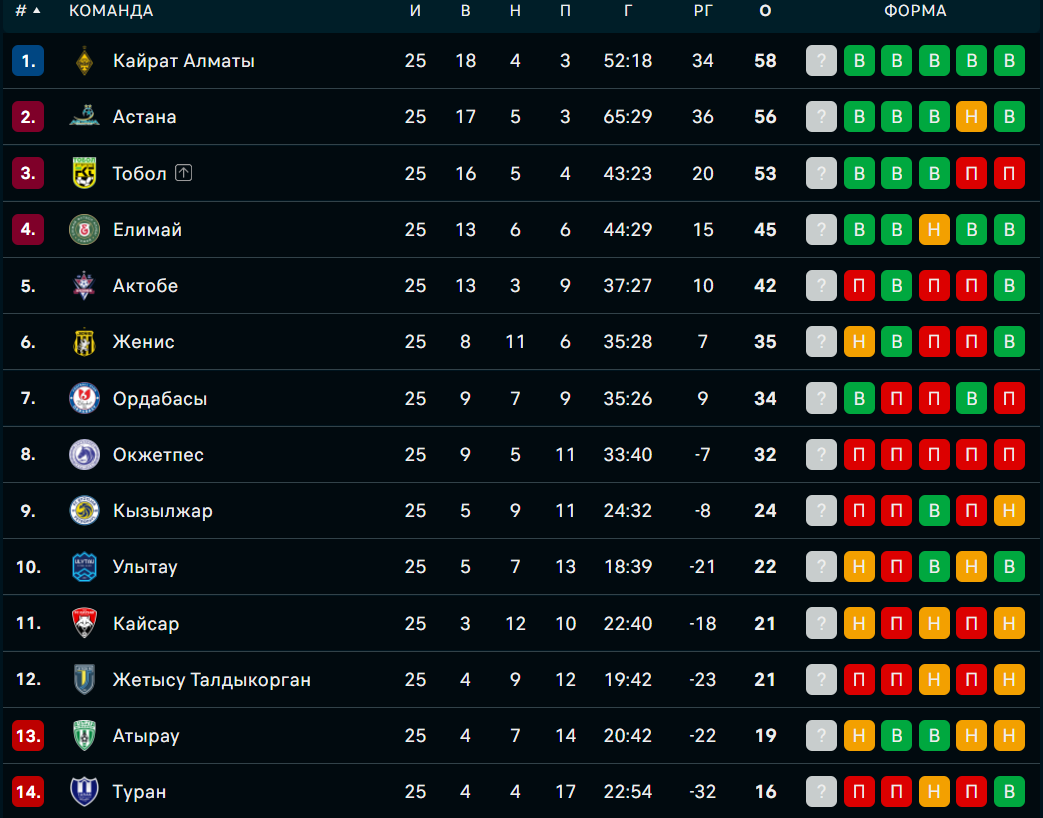 Ранее "Кайрат" сыграл вничью с "Астаной" (1:1) и занял первое место, набрав 59 очков после 26 сыгранных туров. Столичный клуб оказался ниже, отстав на два балла.