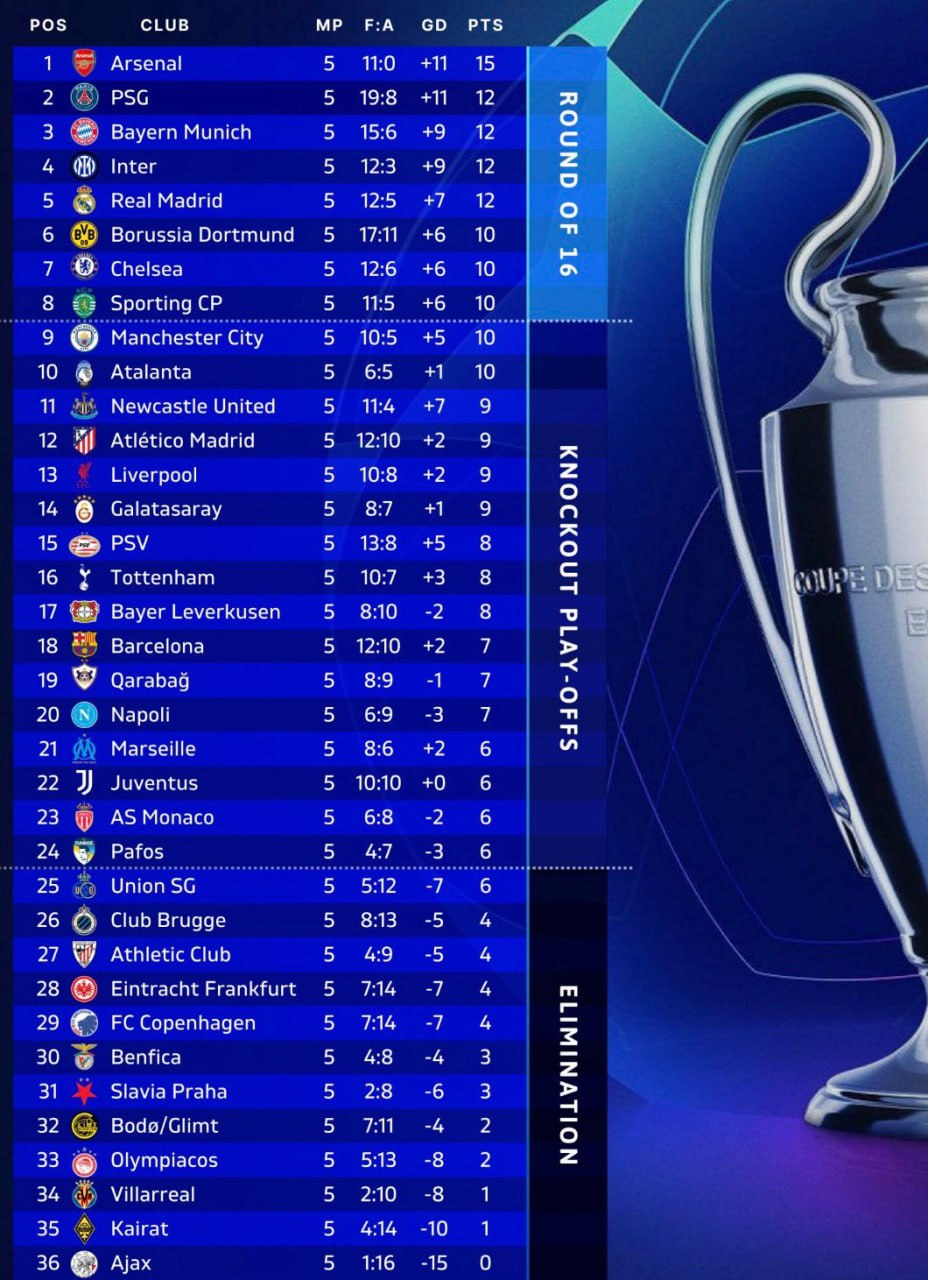 В топ-5 также действующий чемпион ПСЖ, "Реал", "Бавария" и "Интер". Восьмёрку лучших на данный момент замыкают "Реал", дортмундская "Боруссия", "Челси" и "Спортинг" - эти команды при сохранении позиций выйдут напрямую в 1/8 финала.
