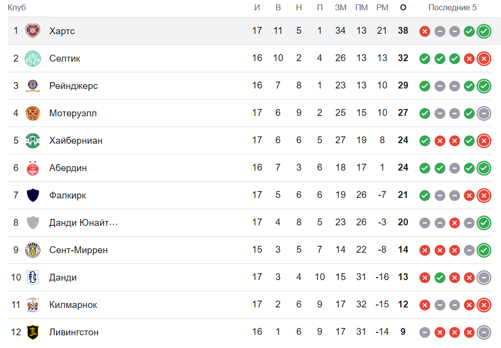 "Хартс" лидирует в турнирной таблице чемпионата Шотландии опережая идущий вторым "Селтик" на шесть очков, но сыграв на одну игру больше.