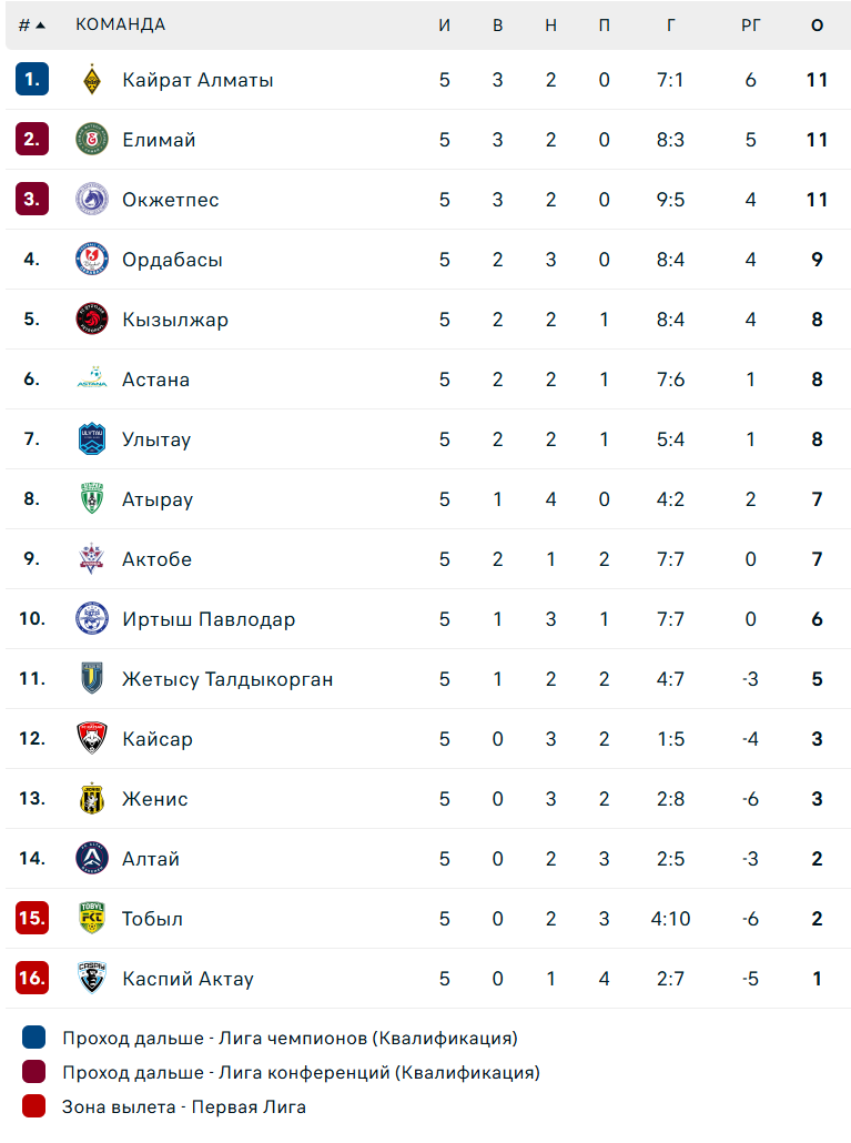 "Кайрат" опережает "Елимай" и "Окжетпес" только по разнице голов - у всех по 11 очков.