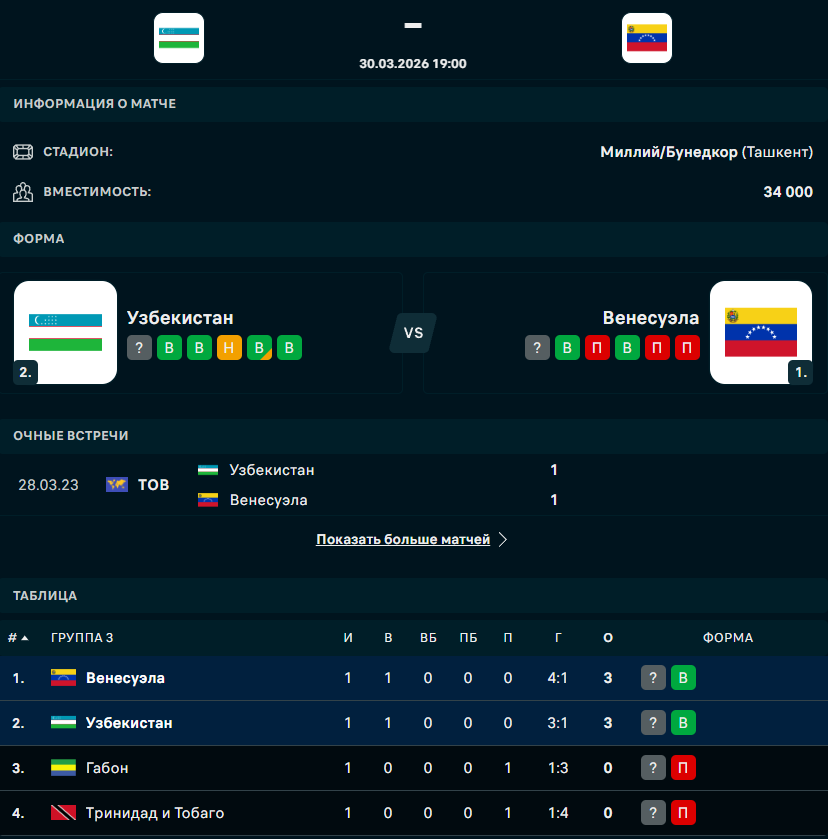 Сегодня, 30 марта состоится матч турнира FIFA Series, в котором встретятся сборные Узбекистана и Венесуэлы, сообщает Спорт Шредингера.