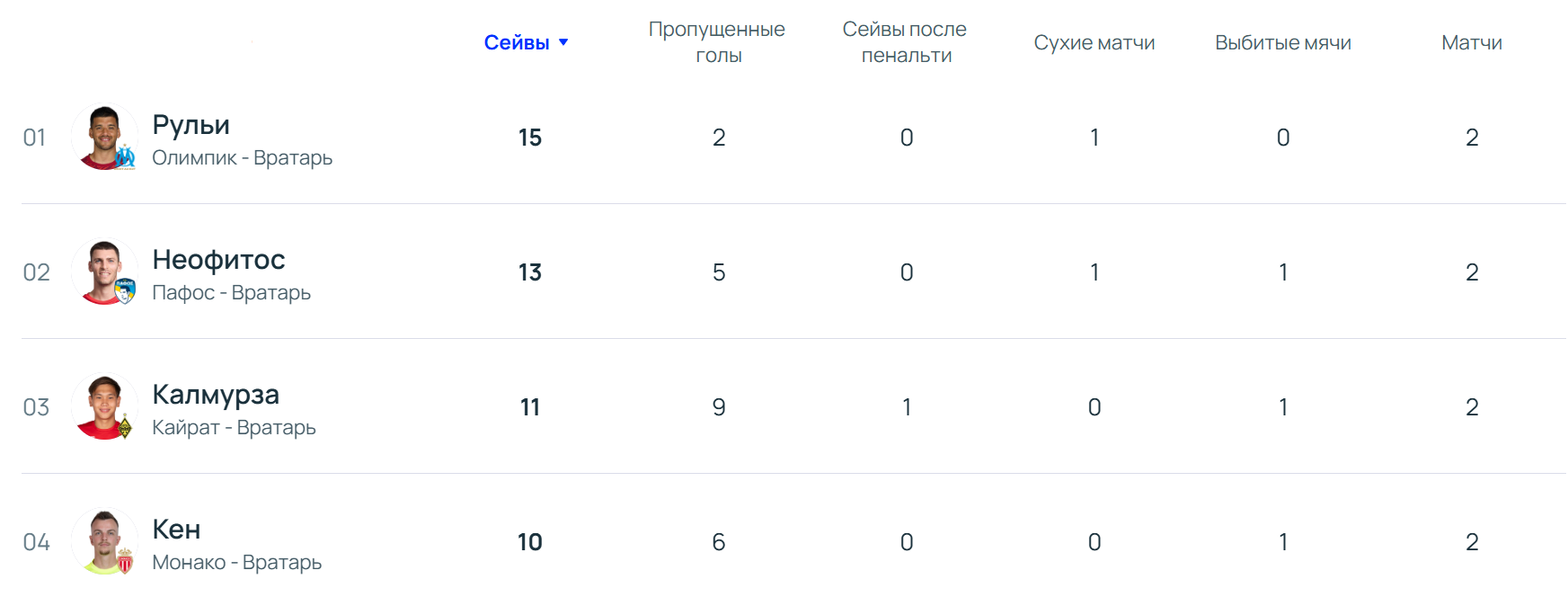 За два тура общего этапа турнира он отразил 11 попыток пробить ворота "Кайрата". Выше него в рейтинге располагаются лишь Херонимо Рульи из марсельского "Олимпика" (15) и вратарь кипрского "Пафоса" Неофитос Михаил (13).