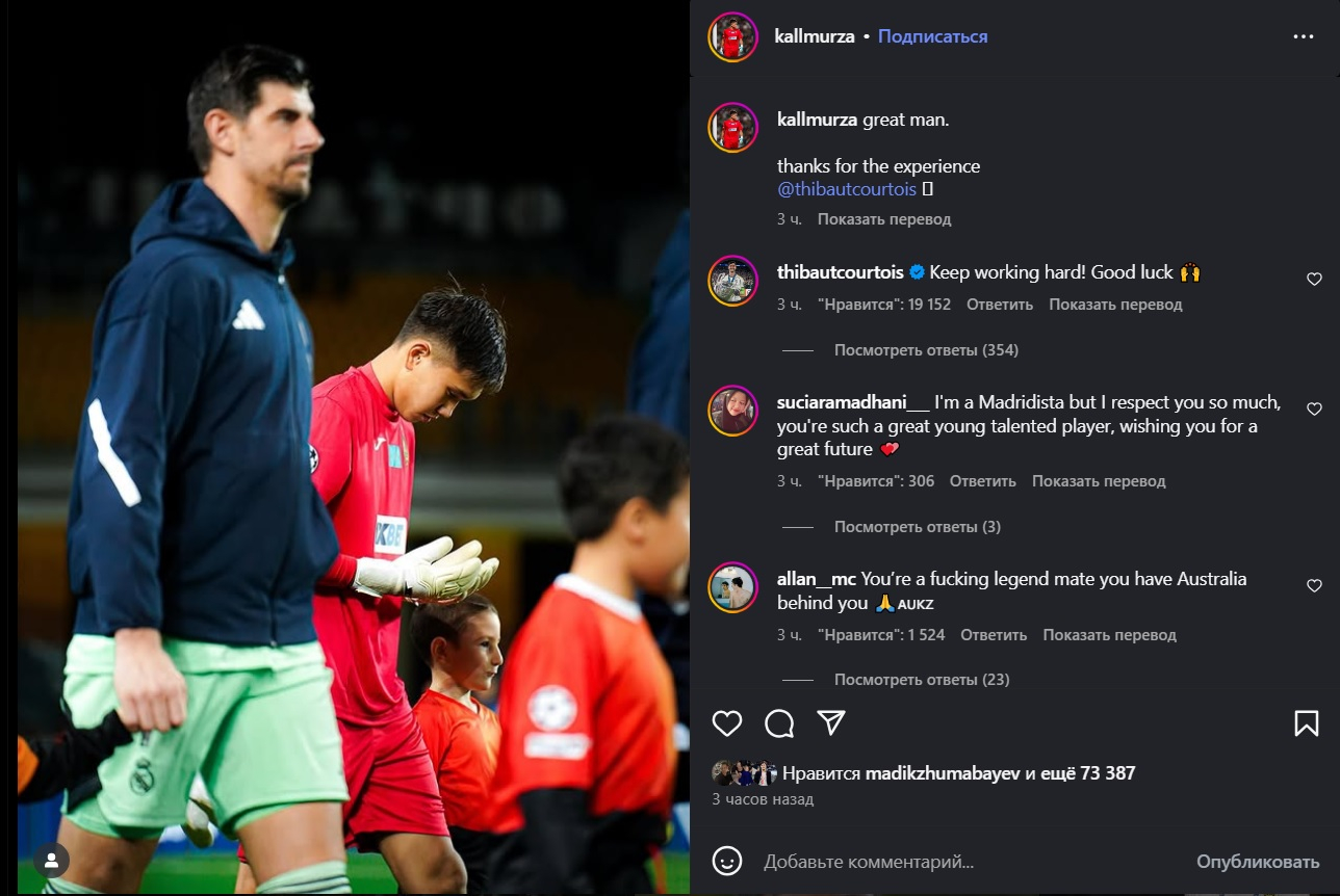 18-летний вратарь "Кайрат" в личном IG опубликовал пост, где тегнул Куртуа и оставил подпись: