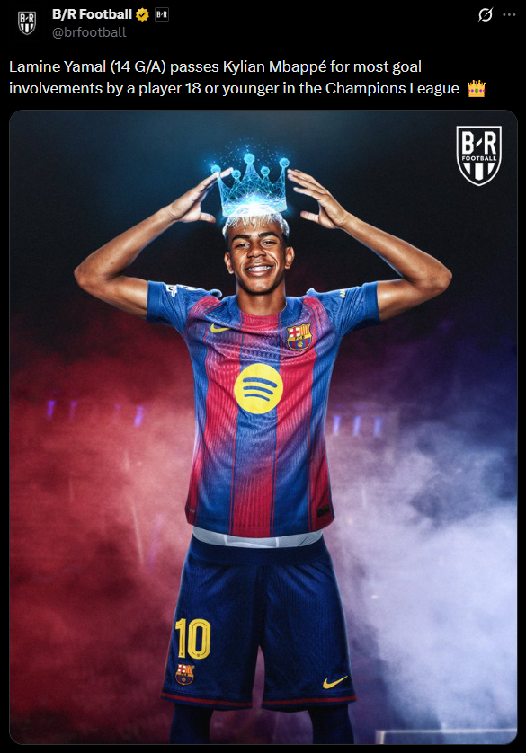 Таким образом на счету испанца оказалось семь голов и семь результативных передач за турнир. Это позволило Ямалю побить рекорд французского нападающего мадридского "Реала" Килиана Мбаппе, на счету которого было 10 голов и три передачи в матчах Лиги чемпионов за время выступления в "Пари Сен-Жермен" и "Монако".