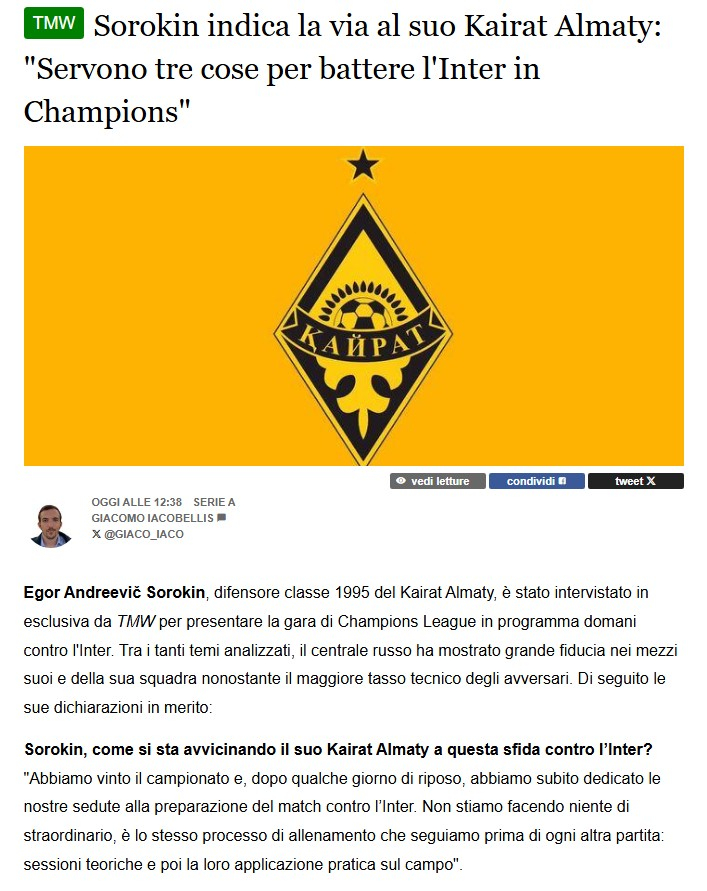 Каждый игрок "Интера" заслуживает внимания. Это очень крепкая, сбалансированная и дисциплинированная команда, где практически все исполнители являются важными фигурами в своих сборных. Но ничего невозможного нет - всё решится на поле, - заявил игрок "Кайрата".