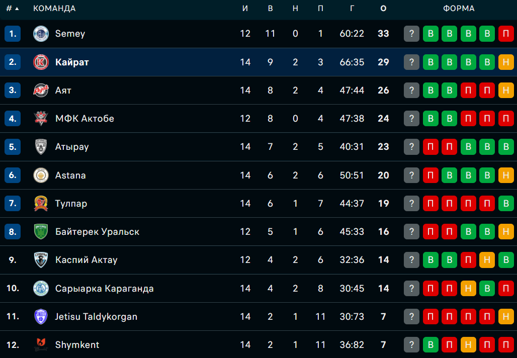 В чемпионате страны "Кайрат" набрал 29 очков после 14 матчей и занимает вторую строчку. Он отстает от лидирующего "Семея" на 4 очка, к тому же у восточноказахстанской команды сыграно на две игры меньше.
