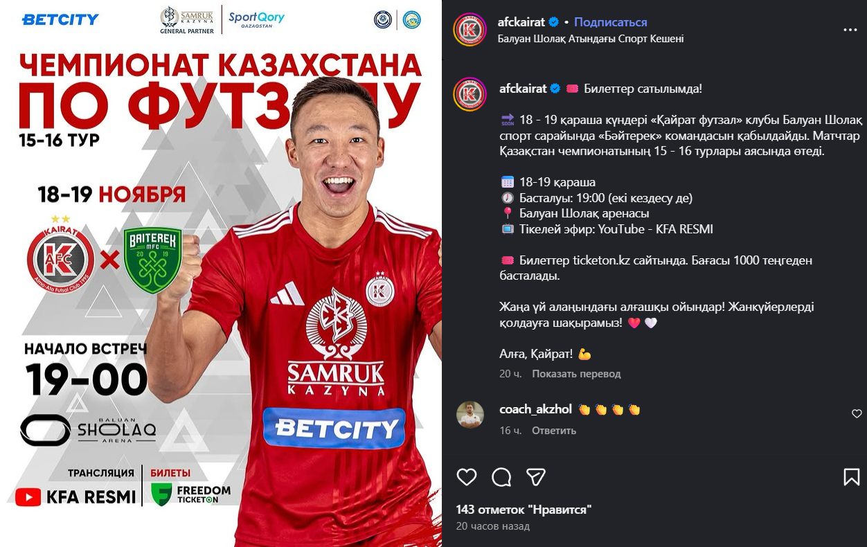 На этой же арене "Кайрат" уже 18–19 ноября проведет свой первый матч со зрителями в нынешнем сезоне против "Байтерека".