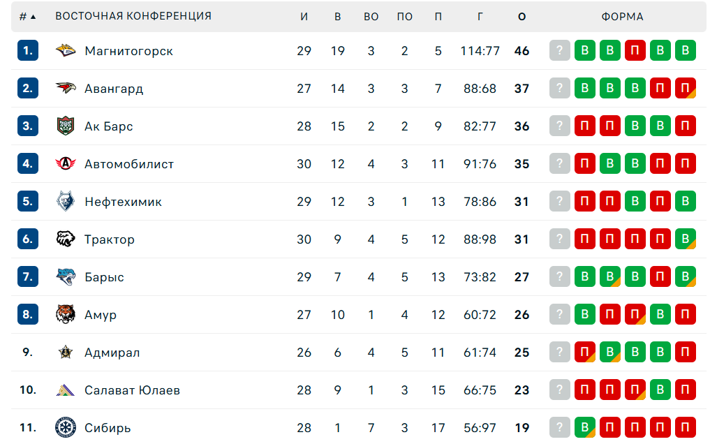 После 29 игр "Барыс" с 27 очками занимает седьмое место в Восточной конференции, у "Салавата Юлаева" - 23 балла в 28 играх, десятая строчка.