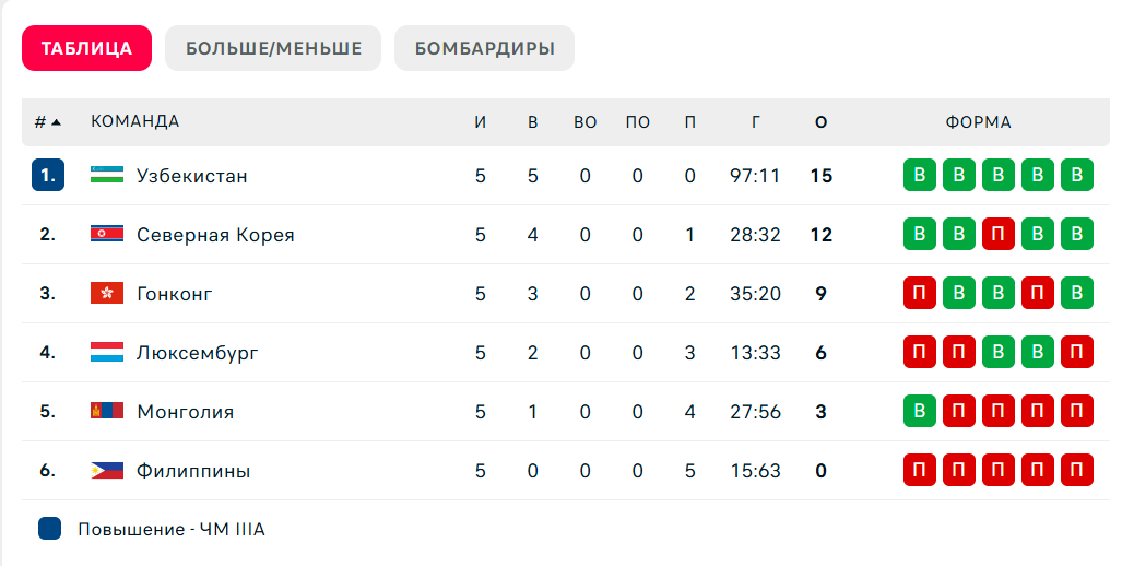 Общий счет по итогам пяти матчей - 97:11. Узбекистан поднялся из группы B в группу А.