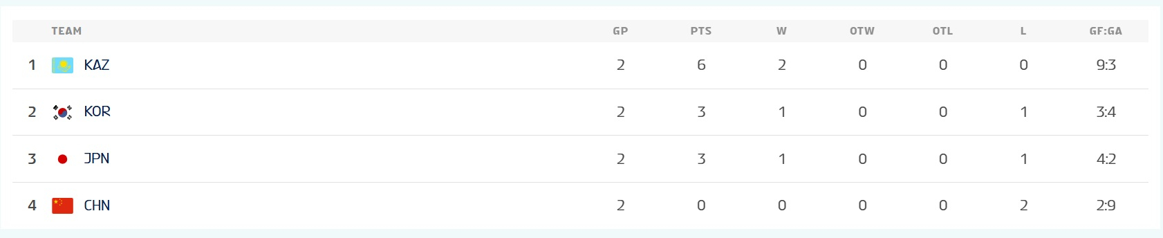 В стартовой игре Казахстан обыграл Южную Корею – 4:2 и теперь единолично лидирует в таблице чемпионата Азии – максимальные шесть очков. Во втором матче дня Корея нанесла поражение Японии – 1:0.
