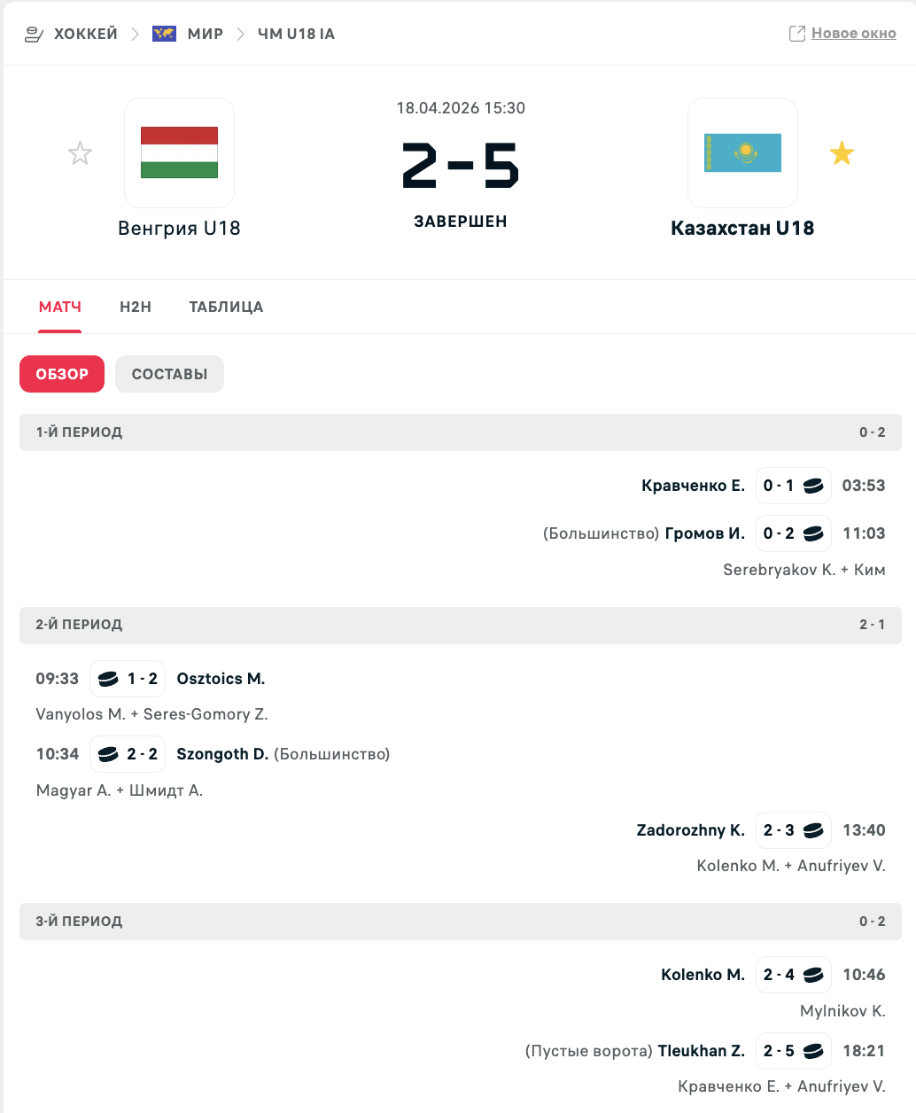 В первом матче турнира казахстанцы обыграли сборную Венгрии - 5:2. Команда уверенно начала встречу, повела 2:0 уже в первом периоде и, несмотря на попытку соперника сравнять счёт во втором, дожала игру в третьем.