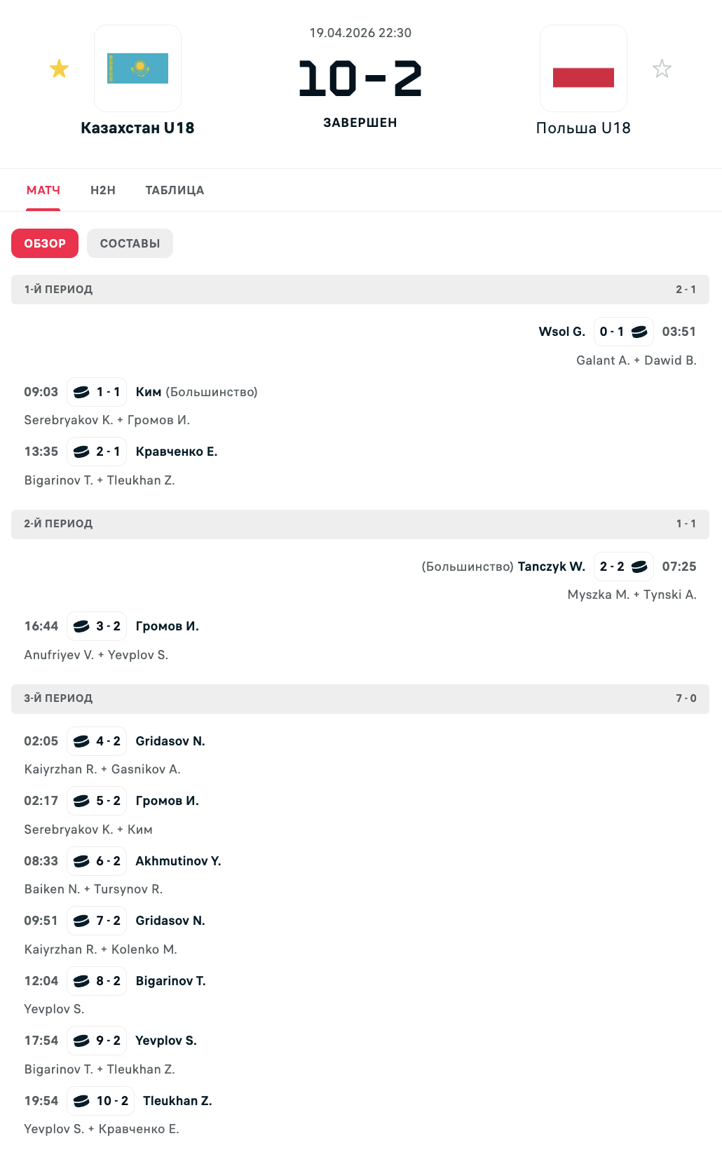 Во второй встрече Казахстан разгромил Польшу со счётом 10:2. После равной борьбы в первых двух периодах (3:2) команда выдала мощный третий отрезок, забросив сразу семь шайб.