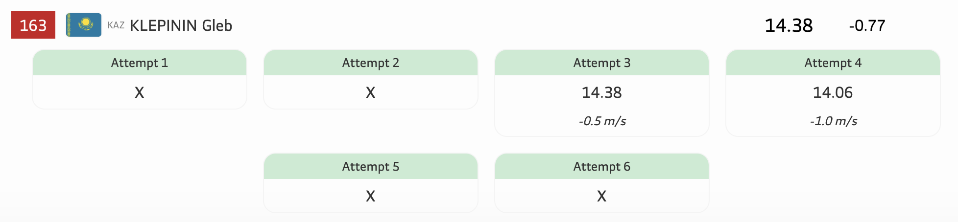 В своей лучшей попытке Клепинин показал результат 14.38 метра, который позволил ему занять третье место.