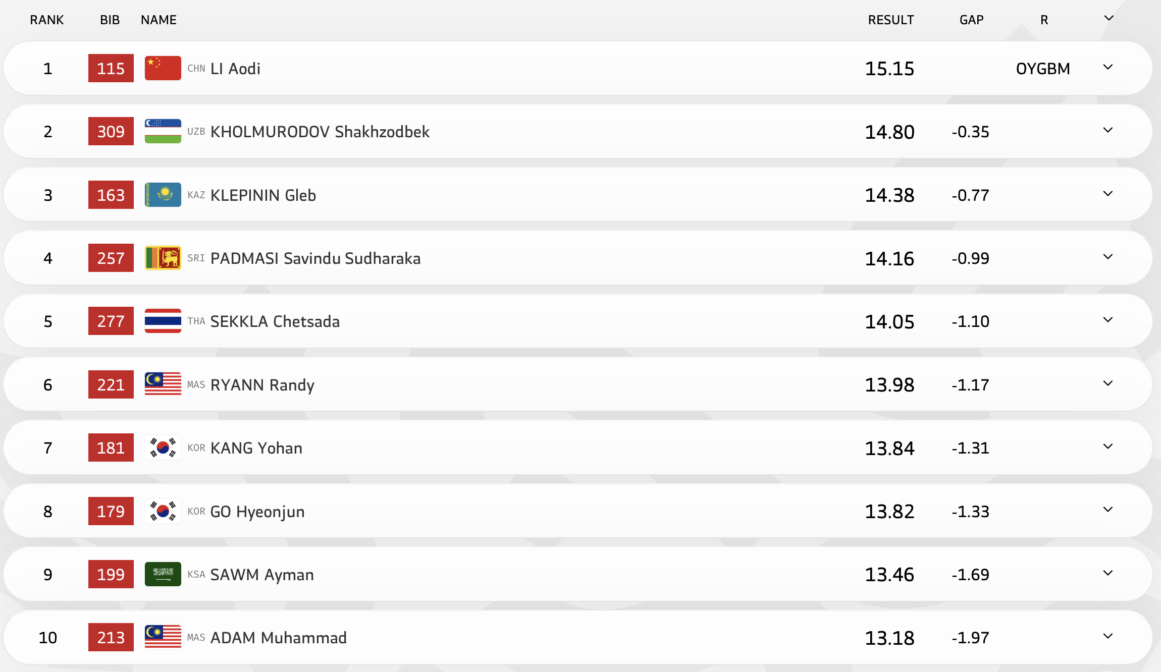 Победителем стал Аоди Ли (Китай) с результатом 15.15 метра, серебро завоевал Шахзодбек Холмуродов (Узбекистан).