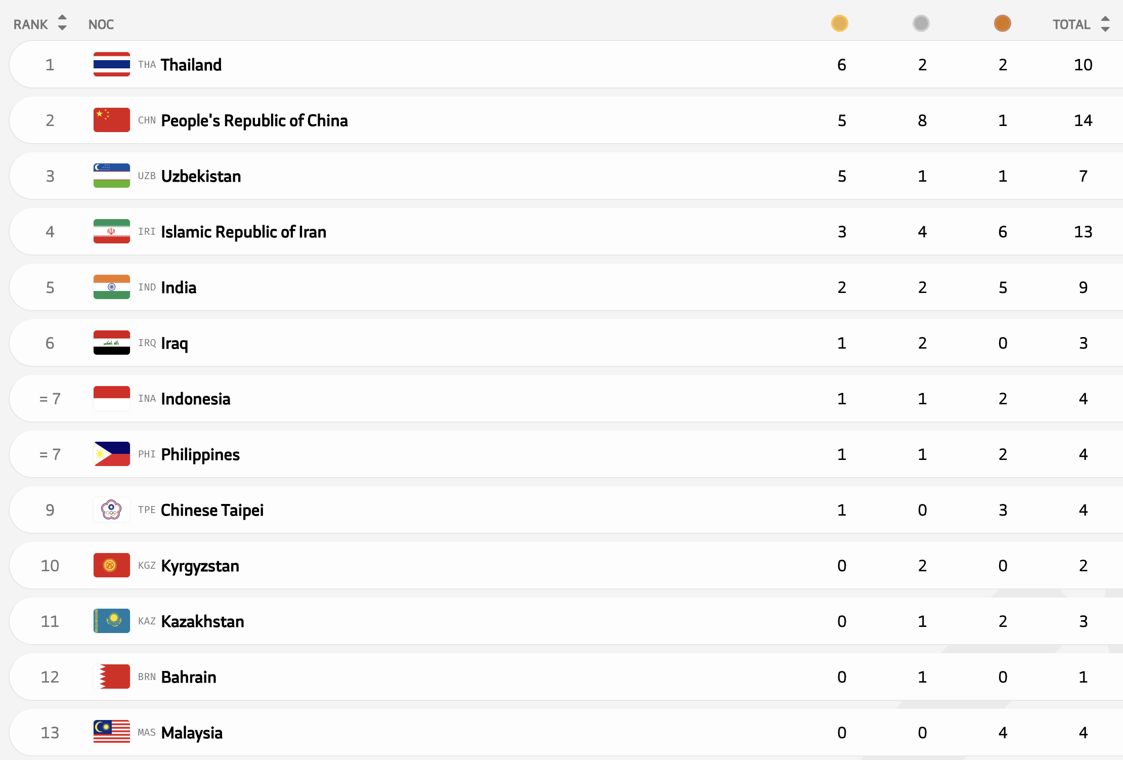 В медальном зачете Казахстан выпал из топ-10, упав на 11-е место. А Узбекистан лишился лидерства - теперь больше всех медалей у Таиланда.