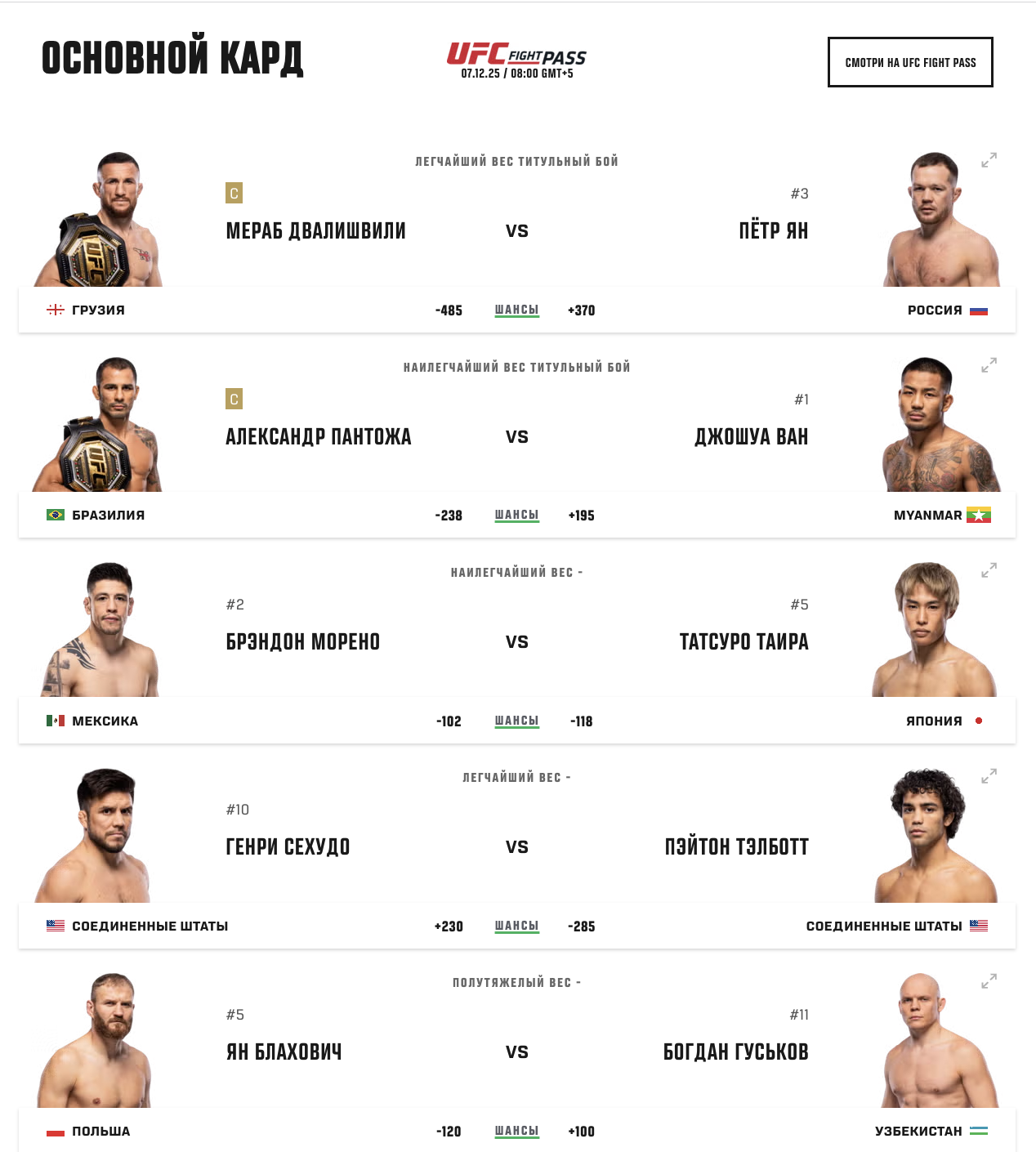 7 декабря в Лас-Вегасе состоится последний номерной турнир UFC в 2025 году. Спорт Шредингера представляет расписание и прямую трансляцию UFC 323.