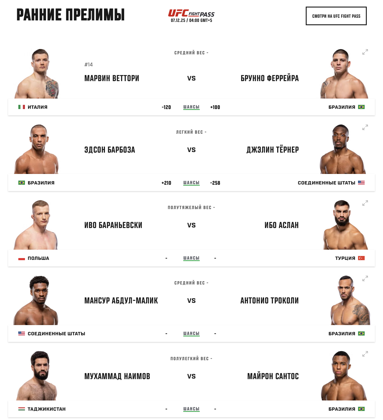 7 декабря в Лас-Вегасе состоится последний номерной турнир UFC в 2025 году. Спорт Шредингера представляет расписание и прямую трансляцию UFC 323.