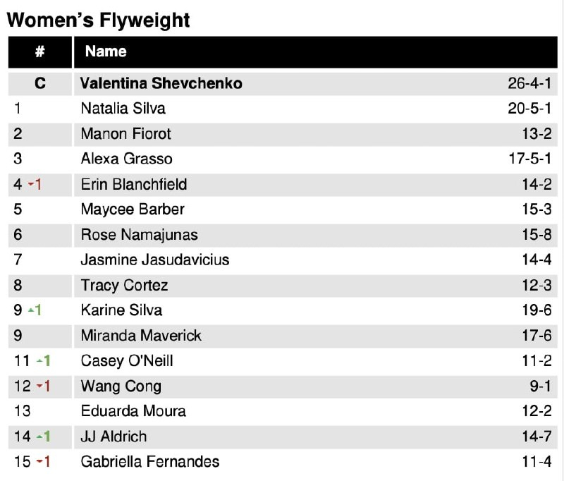 Первые изменения коснулись женского наилегчайшего веса. Кейси О'Нилл после победы над Габриэллой Фернандеш поднялась на одну строчку, а ее оппонентка потеряла одну позицию и теперь замыкает топ-15.