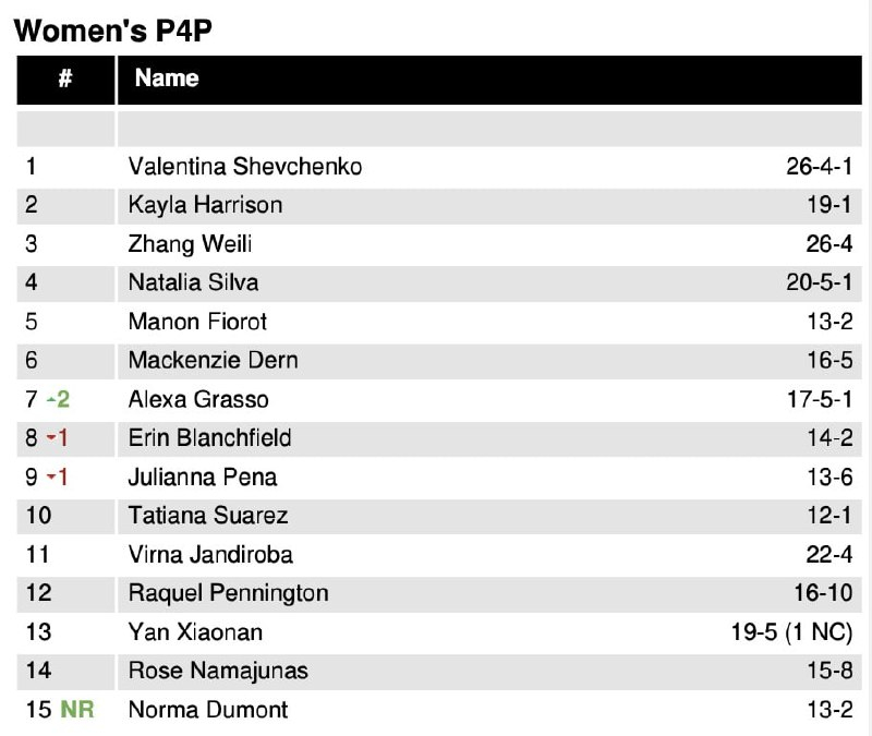 В женском рейтинге P4P (вне зависимости от весовых категорий) Алекса Грассо после жесткого финиша над Мейси Барбер поднялась на две позиции и теперь занимает седьмое место.