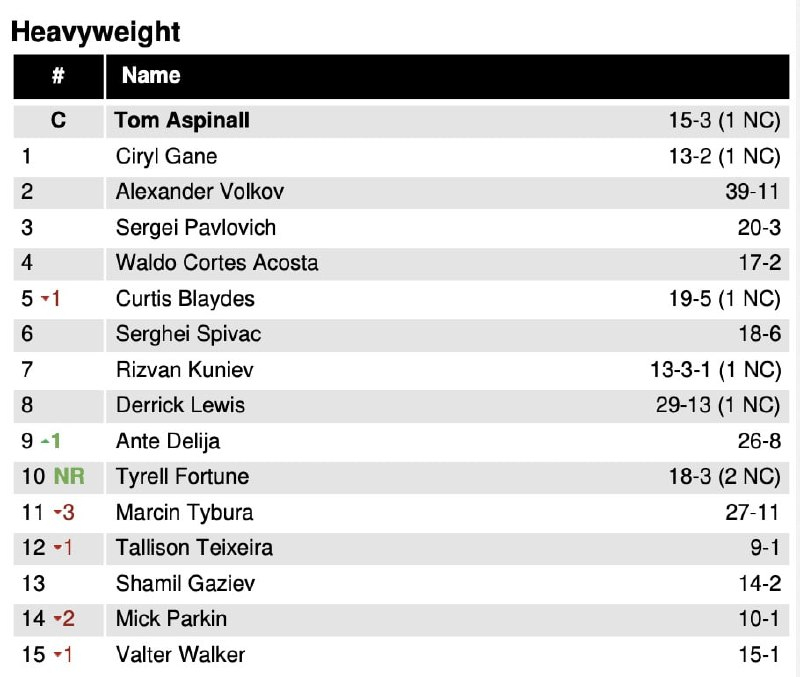 Следующие значительные изменения произошли в тяжёлом весе UFC, где в топ-10 ворвался Тайрелл Форчун. Американец успешно дебютировал, победив Марчин Тыбура решением судей, выйдя на бой на коротком уведомлении. При этом сам Тыбура потерял сразу четыре позиции в рейтинге.