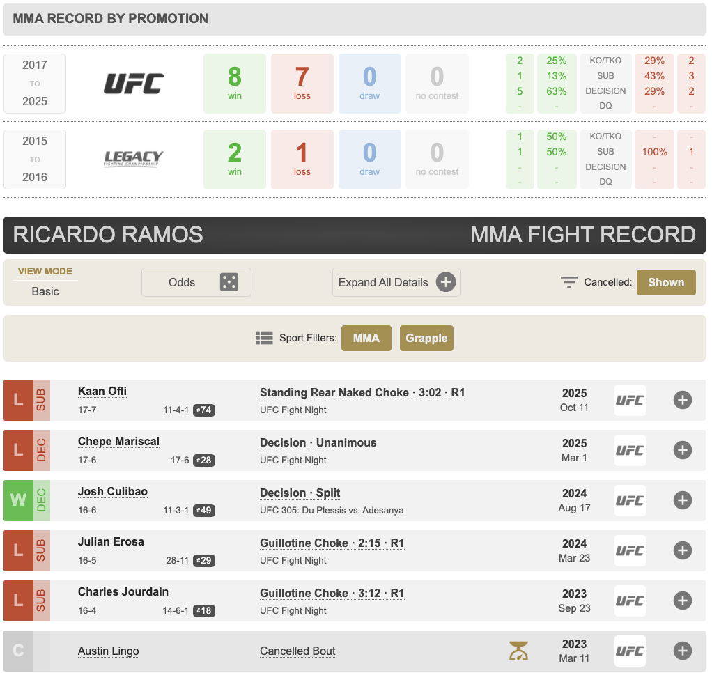 Среди тех, кто покинул ростер, оказался бразилец Рикардо Рамос - бывший участник полулёгкого дивизиона. За последние пять поединков он потерпел четыре поражения и завершил выступления в UFC с рекордом 8 побед и 7 поражений.