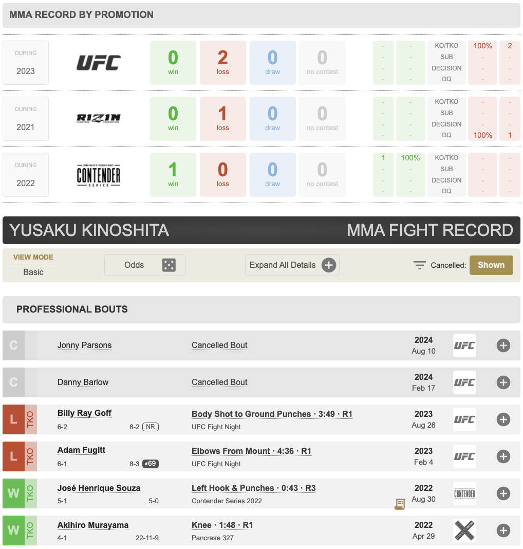 Также из промоушена был уволен японец Юсаку Киношита, выступавший в полусреднем весе. Оба его поединка в UFC завершились досрочными поражениями.