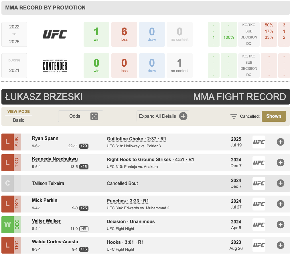 Пятой жертвой чистки стал тяжеловес Лукаш Бржески. Польский боец проиграл три последних боя досрочно и завершил выступления в UFC с рекордом 1-6.