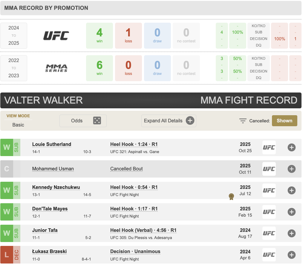 На турнире UFC 321 бразилец Вальтер Уокер (15-1) в дебюте поединка продемонстрировал свою визитную карточку - в четвёртый раз подряд в UFC он завершил соперника приёмом скручивания пятки (heel hook), сообщает Спорт Шредингера.