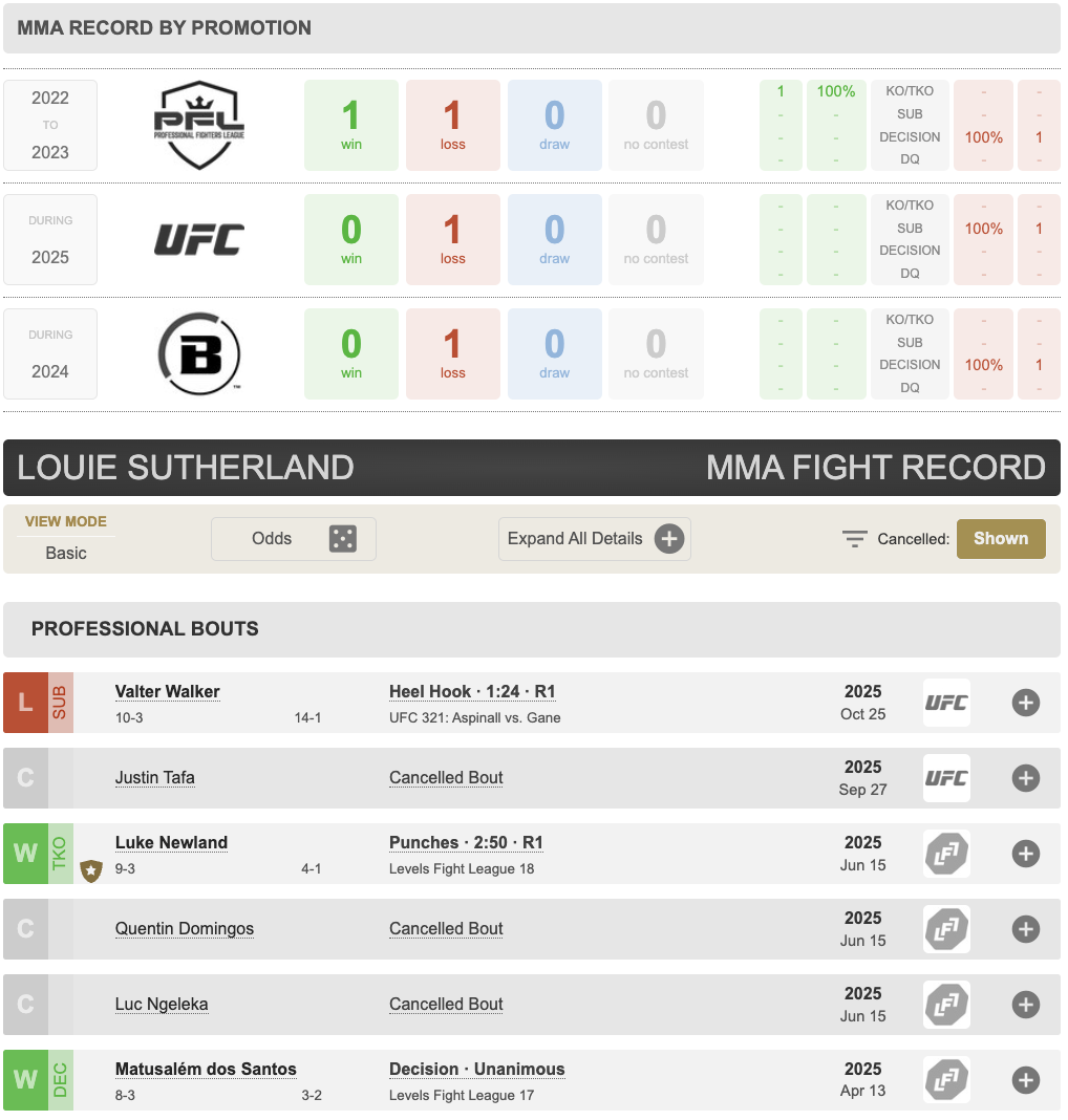 Для Луи Сазерлэнда (10-4) поединок стал дебютом в лиге; поражение прервало его серию из четырёх побед.