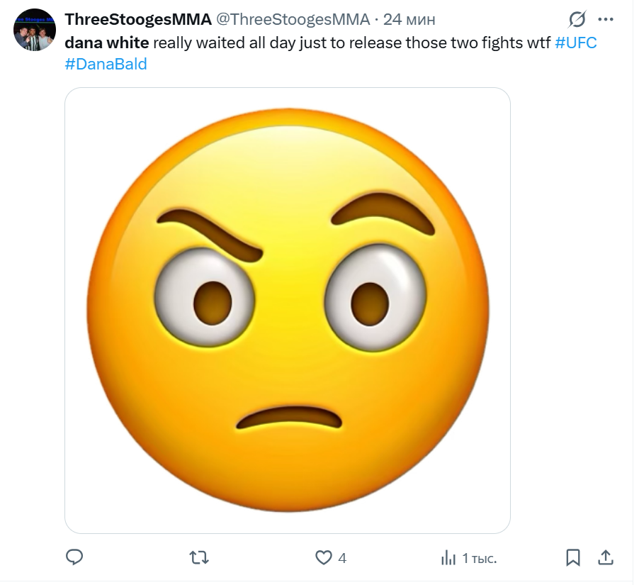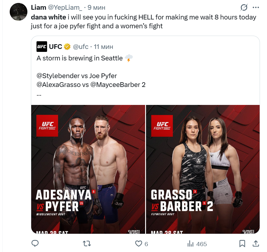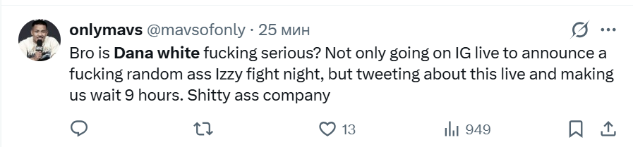"Бро, Дана Уайт это серьезно? Не просто выйти в эфир IG, чтобы объявить ебу*ий рандомный бой Изи, но еще и твитнуть об этом прямом эфире и заставить ждать нас 9 часов. Отвратительная компания"