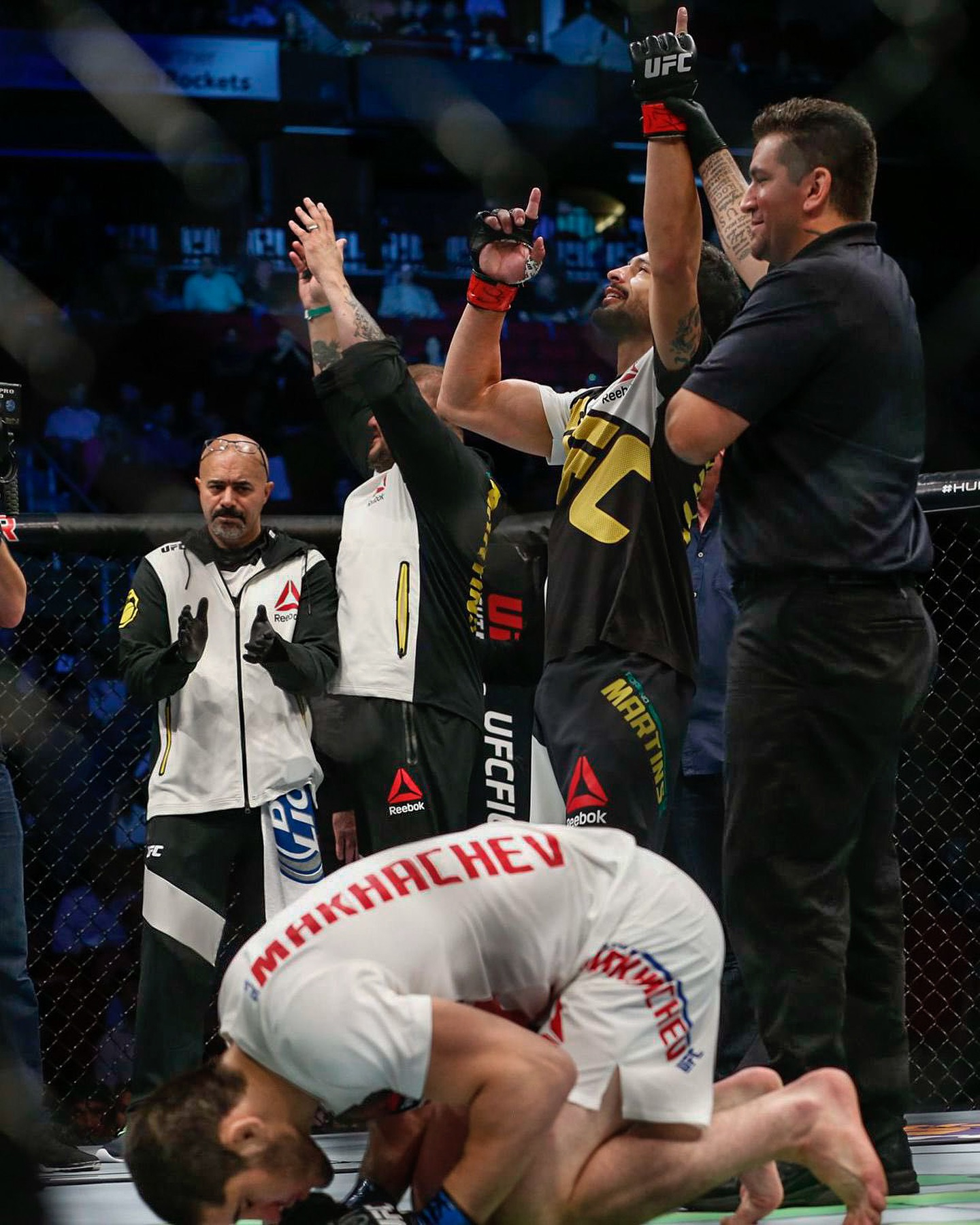 3 октября 2015 года на UFC 192 в Техасе Махачев с рекордом 12-0 в ММА и 1-0 в UFC встретился с бразильцем Адриано Мартинсом. Исламу в том месяце исполнилось 24 года, Мартинсу было 33 - его рекорд в UFC был 3-1, а в ММА провел уже 34 боя - 27 побед.