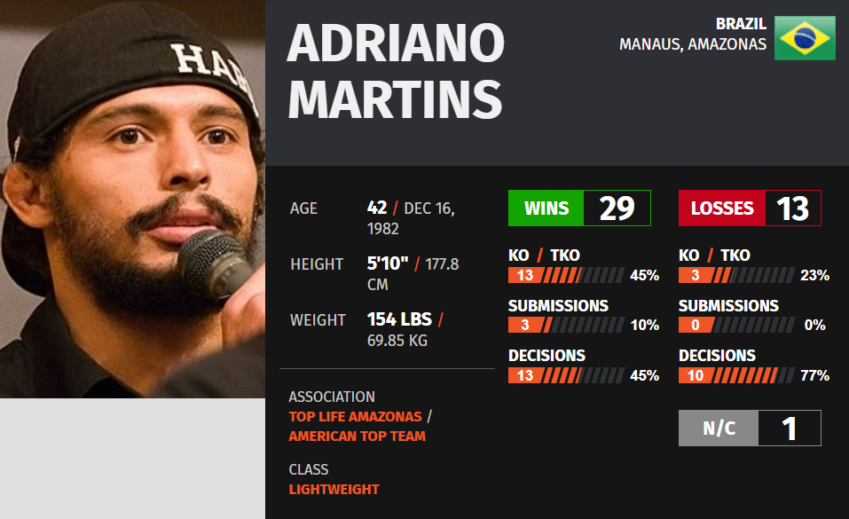После Ислама Адриано провел два боя в UFC - оба проиграл: решение и нокаут. Всего в UFC у бразильца 5-2, брал три бонуса, самый известный соперник до Махачева - Дональд Серроне.