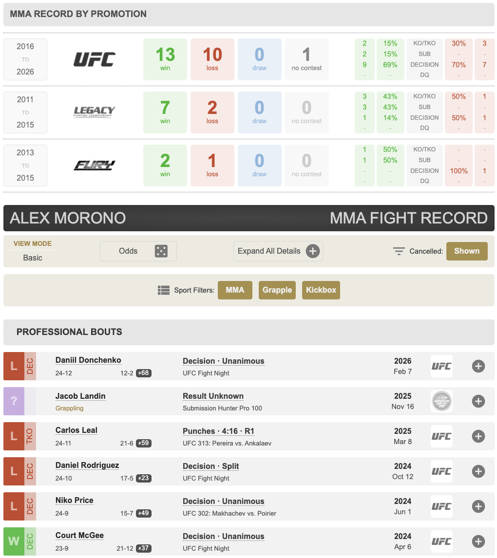 Для 35-летнего Мороно этот бой стал 24-м в UFC и четвертым поражением подряд. Его рекорд теперь составляет 24 победы и 13 поражений.