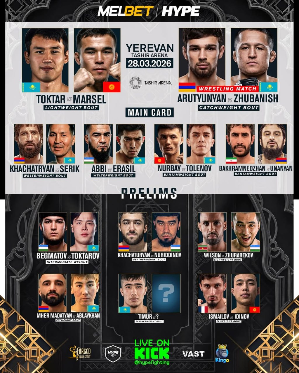 28 марта в Ереване (Армения) состоится турнир Hype Fighting Asia, главным событием которого станет бой казахстанца Еркебулана Токтара против кыргызстанского бойца Марселя Нурланбек уулу, сообщает Спорт Шредингера.