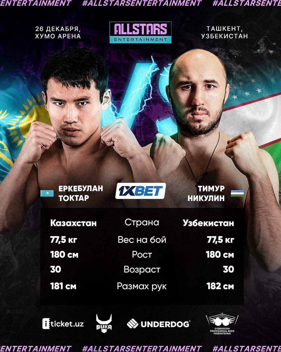 Звезда кино и ММА из Казахстана Еркебулан Токтар приехал в Ташкент, где 26 декабря будет боксировать в главном событии турнира All Stars против узбекистанца Тимура Никулина, сообщает Спорт Шредингера.
